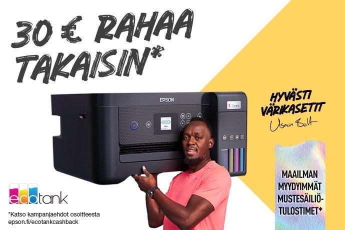 30 € rahaa takaisin kampanjaan kuuluvista EcoTank-tulostimista 01.04.2025 – 30.06.2025 välisenä aikana. Sano hyvästit mustekaseteille ja säästä tulostuskuluissa.